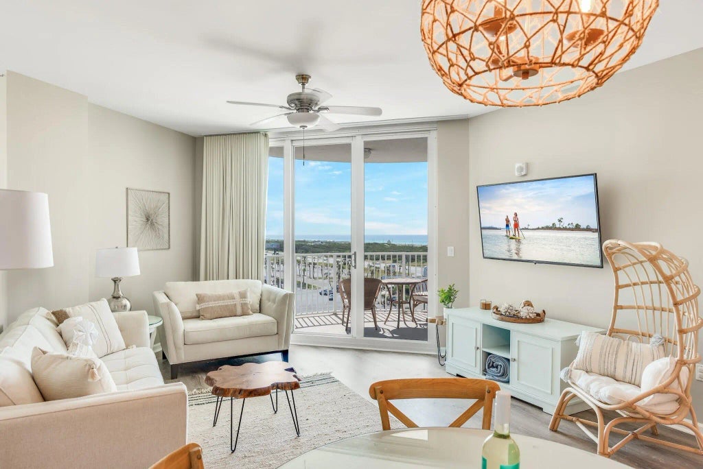 Experience breathtaking, unobstructed views of Henderson State Park and the Gulf from this stunning 8th-floor unit at the prestigious Palms of Destin! This fully furnished 2-bedroom, 2-bath unit is turn-key ready and has it all. Recently updated in 2020, it features Luxury Vinyl Plank (LVP) flooring, fresh paint, a new dishwasher, new over the range microwave and built-in bunks, enhancing its rental potential. A new air conditioning system was also installed in 2023 and a new water heater in 2024! The kitchen boasts granite countertops and painted maple cabinetry.The living room is comfortably appointed with a flat screen TV, a ceiling fan, coastal furniture, and ample seating. The second bedroom includes built in bunks and a flat-screen TV, and a front load washer and dryer (2022), while the master suite offers a king-size bed, a flat-screen TV, and a ceiling fan.